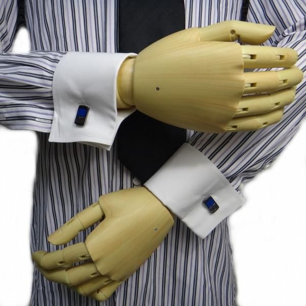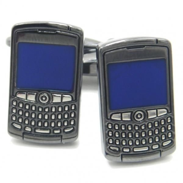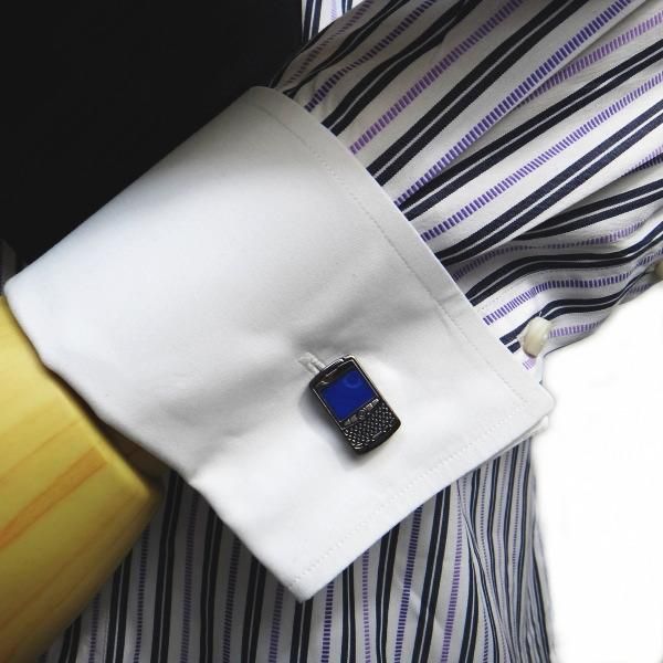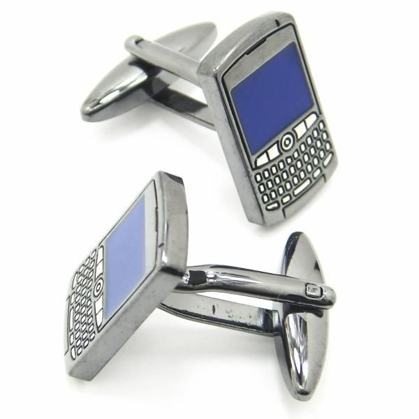 メタリックブラックのスタイリッシュなボディに、ブルーの液晶画面の携帯電話モチーフのカフス。