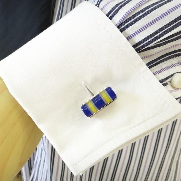 ブルーとイエローが、夏の海のブルーと太陽の日差しの様に、爽やかにカラフルな華やかさのあるカフスです。夏の日差しの様に、温かくも爽やかな笑顔のあの人に!!