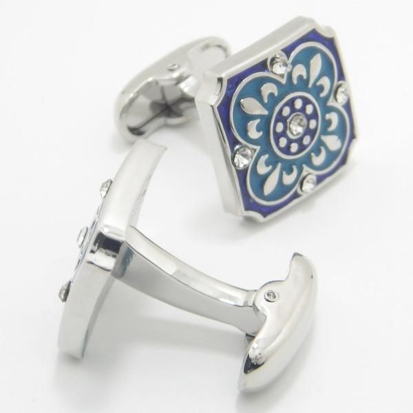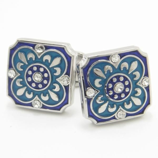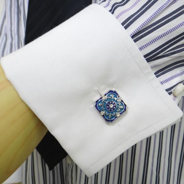 アラベスク形式の花や蔦の文様を反復的に用いた、アラビアンモザイクタイルの様なエキゾチックなデザインに、ブルーのエナメルが美しく、そしてキラリと輝くクリアストーンが好バランスのカフス。