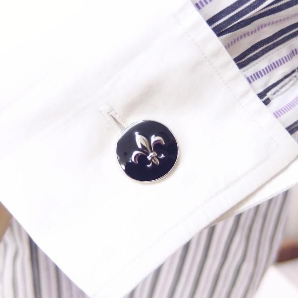 艶やかなブラックベースにシルバーのフランス王家のシンボル、フルール・ド・リス(百合の紋章)がドラマティックに浮かび上がるカフスボタン。