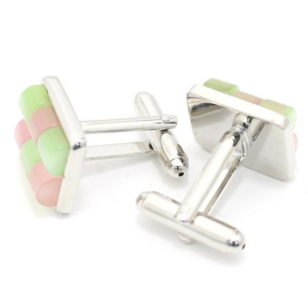 カマボコ型にカッティングされたピンクとグリーンの可愛い色のキャッツアイが交互に並び、スクエア型にシェイプされたカフスボタン。
