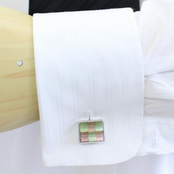 ピンク×グリーン・キャッツアイ・チェックブロックのカフス(カフリンクス/カフスボタン)