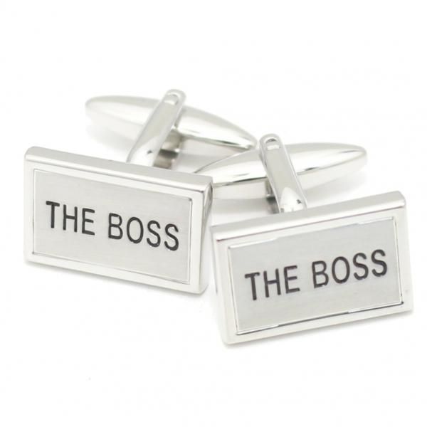 艶やかなシルバーの縁取りに、マットなシルバーに黒い文字で「THE BOSS」と刻印されたカフスボタン。
