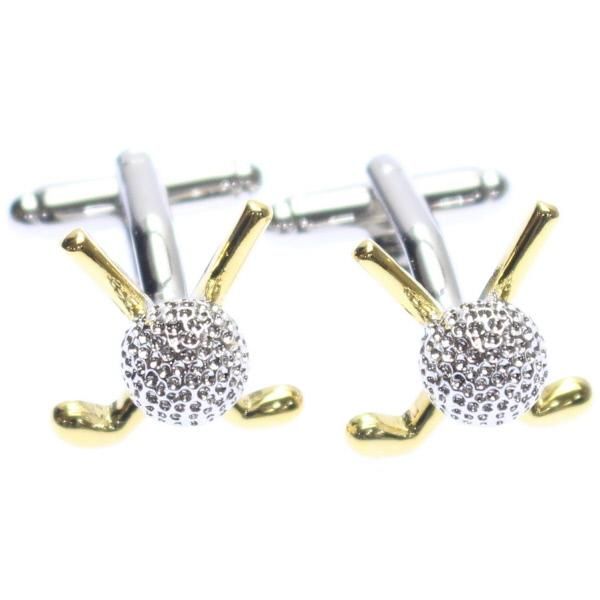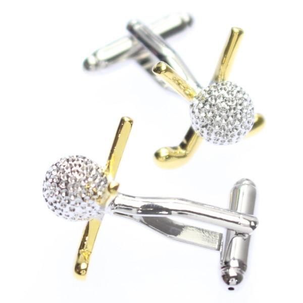 ゴールドのゴルフクラブと、シルバーのゴルフボールのユニークなカフス。
