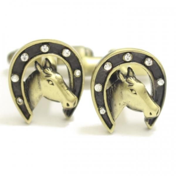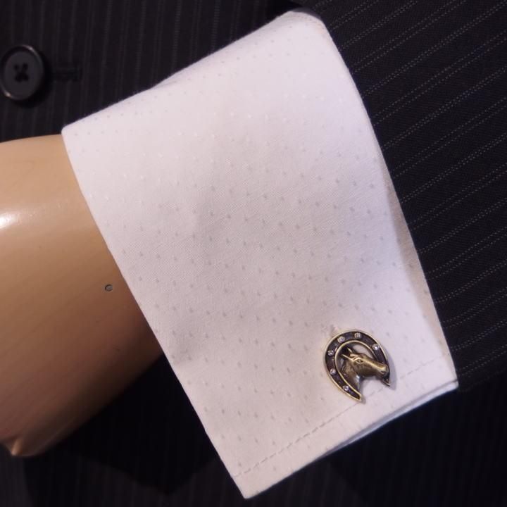 斜めを向いた凛々しい表情の馬とキラキラのクリアストーンがあしらわれた馬蹄が組み合わさったドラマティックなムードのデザインカフス。