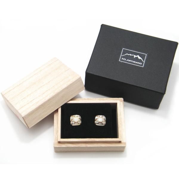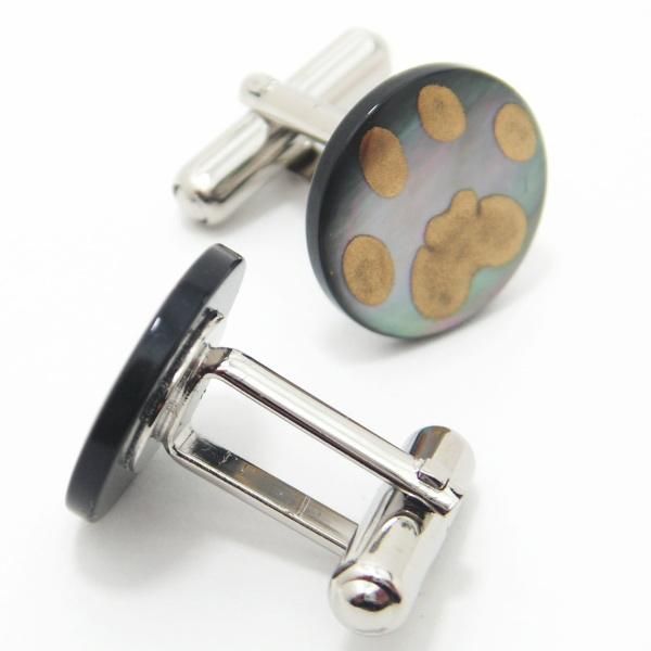 薄っすらと闇夜のように透ける黒蝶貝に、金色に輝く肉球がとっても粋な、遊び心満点の蒔絵カフス。古式ゆかしい伝統工芸と肉球という斬新な前衛デザインのコラボがユニークです。