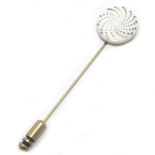 やわらかく独特な貝の輝きとリズミカルに並んだ金の点が見事に調和し、光を受けて金色に輝く美しいラペルピン(ラペルブローチ)です。