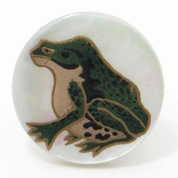 オーロラの様な光沢のある白蝶貝に、カエルが金粉等で描かれています。
