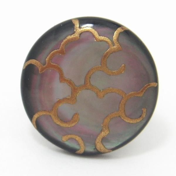 蝶貝とは、真珠を育てる貝の一種で、真珠の様な輝きをします。蝶貝の中でも、色のある黒蝶貝に金粉で模様が描かれています。