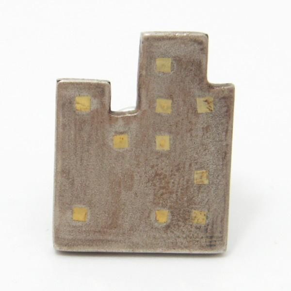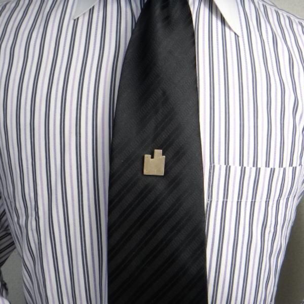 桧に金粉・漆塗りで作られた、凹凸シルエットのビル型タイタック・ピンブローチ。