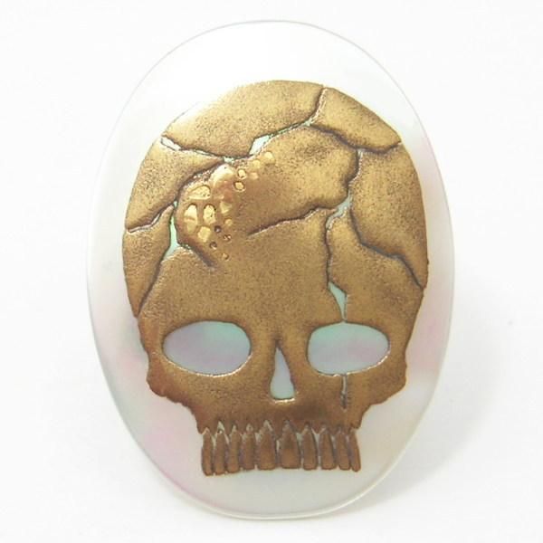 そんな美しい夜光貝に、金の蒔絵でドクロが描かれており、ドクロの頭には金の板が埋め込んであるという、何とも凝っていて愛嬌のある逸品です。