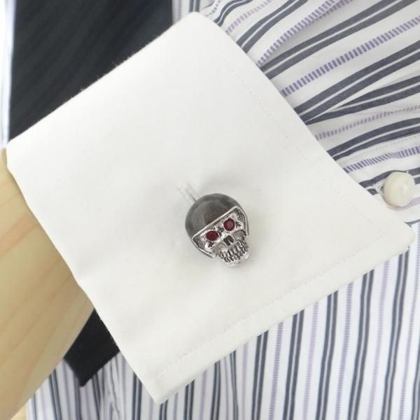 ブラックのイラスト入りグレーのヘルメットをかぶり、赤い瞳がワイルドに輝くスカルが、ムードたっぷりなカフス。