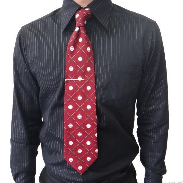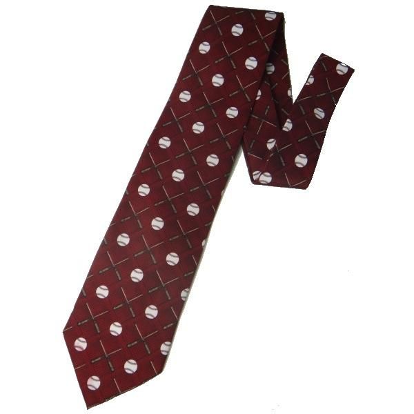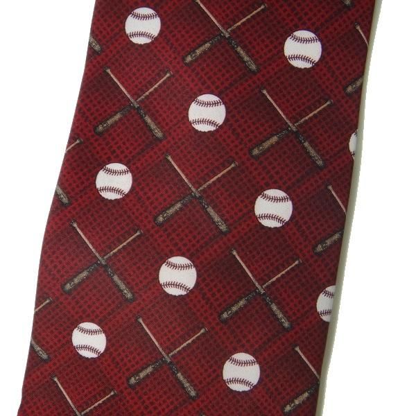 落ち着いた赤地に、クロスしたバットと野球ボールが並んだユーモラスなネクタイ。