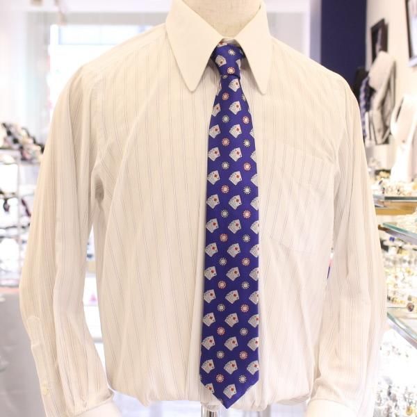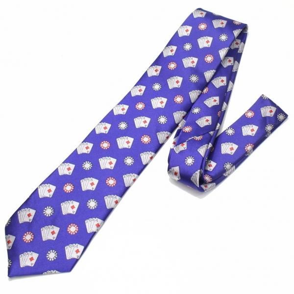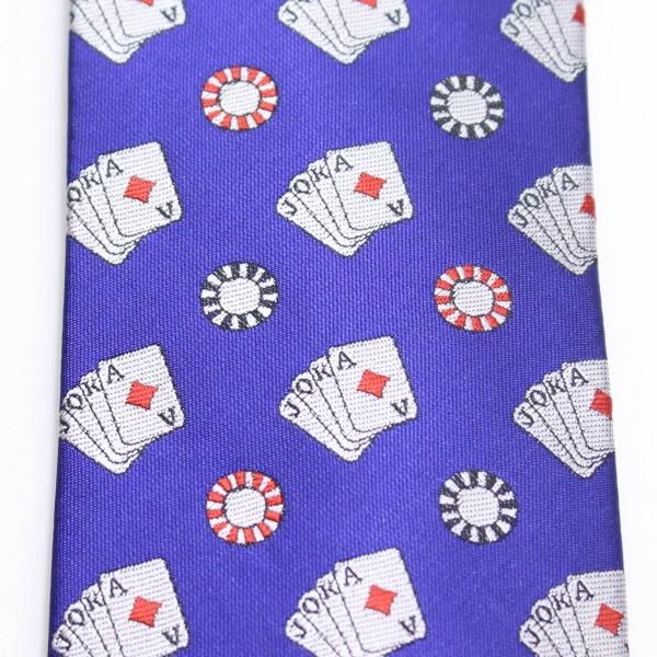 青地にトランプのポーカーとチップがコミカルに並んだ賑やかなネクタイ。