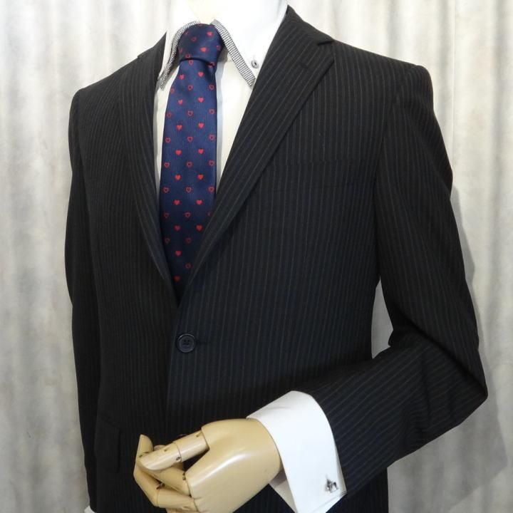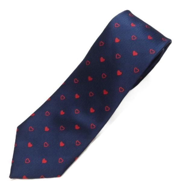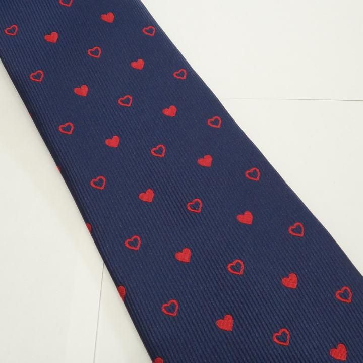 紺地のネクタイに小さな赤いハートが散りばめられたデザイン。