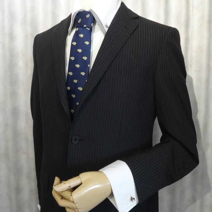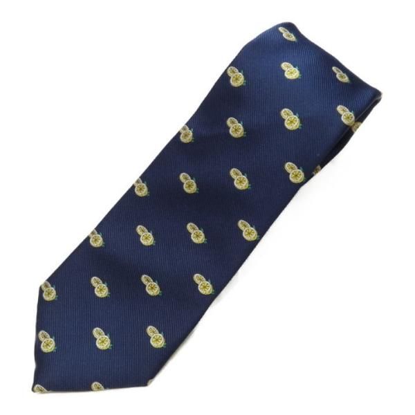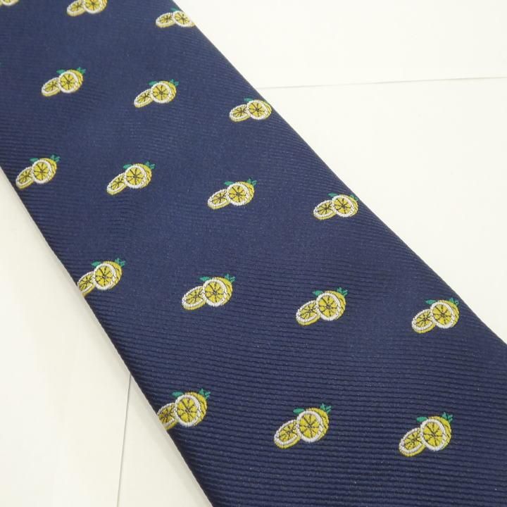 紺地のネクタイに小さなレモンが散りばめられたデザイン。