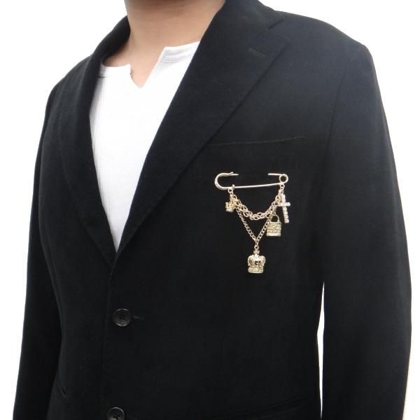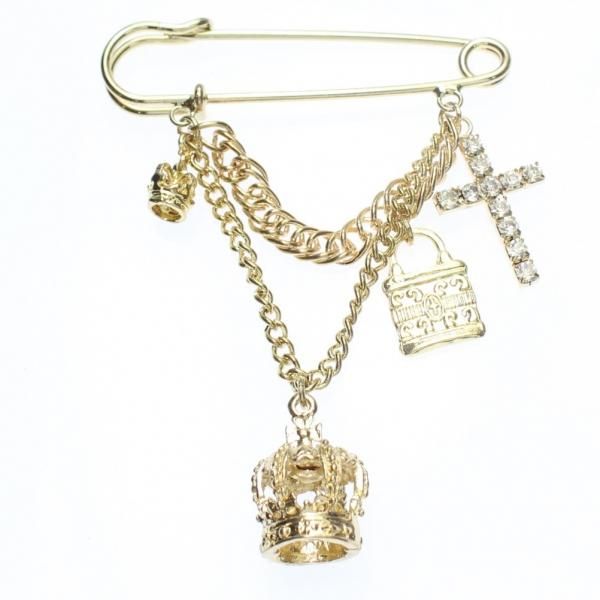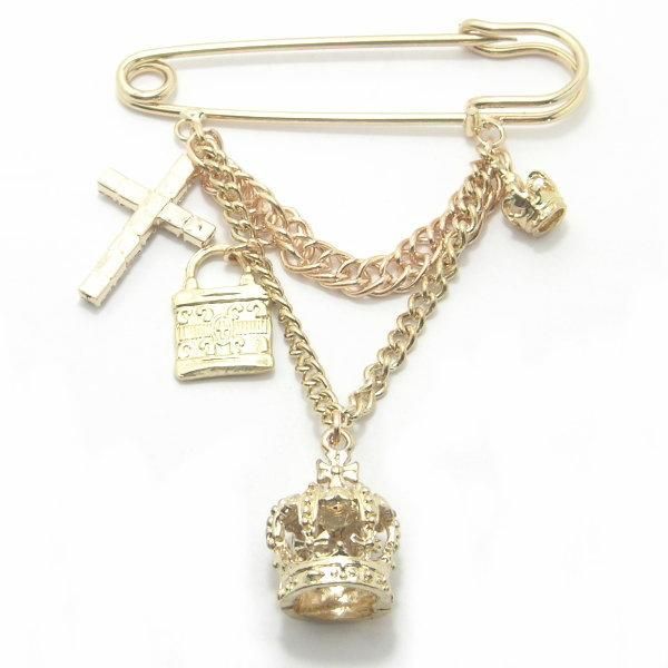 ラペルピン・ゆらゆらチェーンと王冠・ゴールドの安全ピンブローチ(ラペルブローチ)