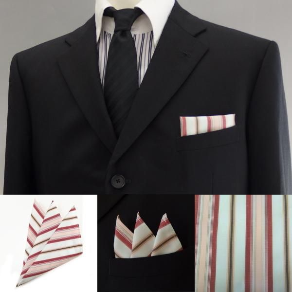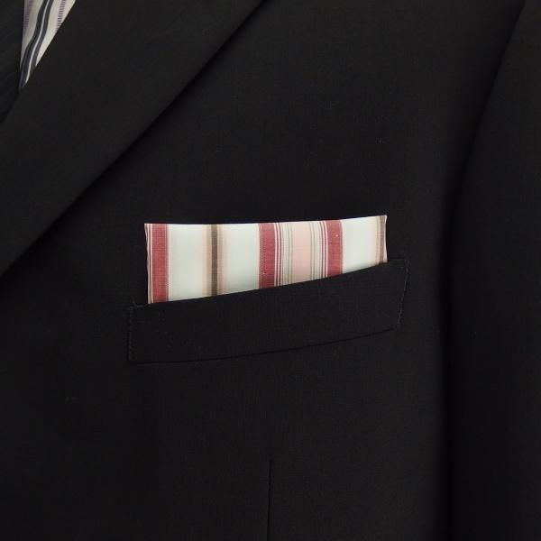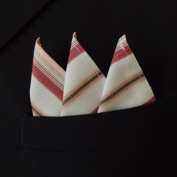 高級オーダーシャツ生地ポケットチーフ・カーキグレー×レッド×ピンクーストライプ柄ポケットスクウェア