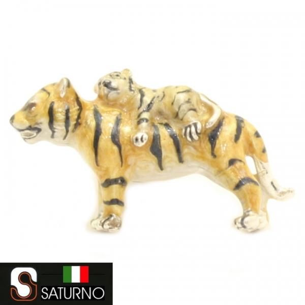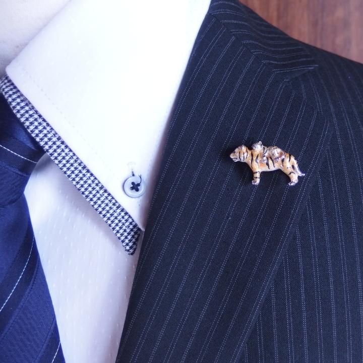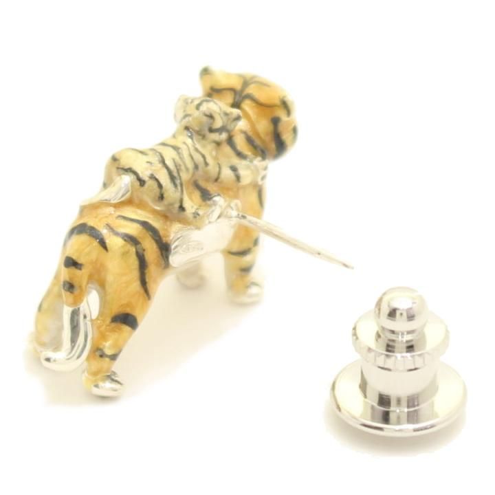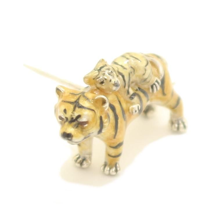 母トラが子トラを背負って仲睦まじい姿に思わずほっこり気分になれる、リアルな造りの虎の親子のラペルピン。