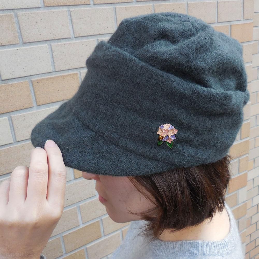 カタツムリが乗ったアジサイのピンブローチ(ピンバッジ/タイタック)です(キャッチはサツルノ製品ではなく、付属品です)。しっとりした雰囲気のアジサイとカタツムリ。静かな雨の日の、ゆったりとした時間の流れを感じます。帽子やジャケットなどと合わせてみてくださいね。