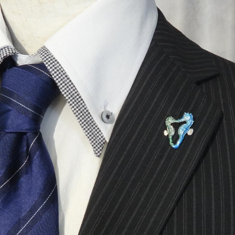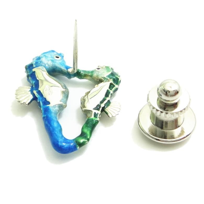 ユニークな姿態で水族館でも人気のタツノオトシゴの銀製ミニチュア動物ピンブローチ/ピンバッジ/タイタックです。しかもキスをしている二匹、その仲睦まじい姿がハートに見えるという、なんとも愛の溢れるデザイン!