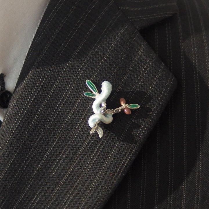 オリーブの木に巻き付いた、あどけない顔つきが可愛いヘビのピンブローチ/ピンバッジ/タイタックです。