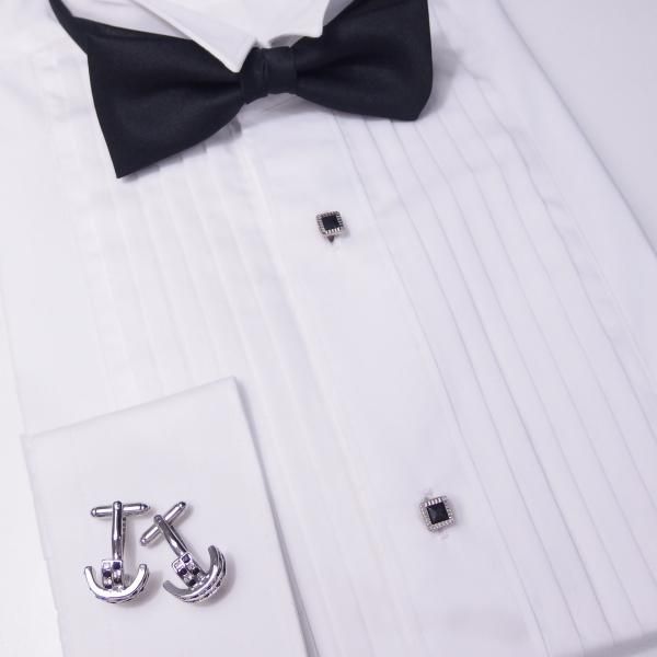 朝のモーニングコートの場合は白蝶貝などの白で、夜のタキシード・燕尾服の場合は黒蝶貝やオニキスなどの黒を着用します。