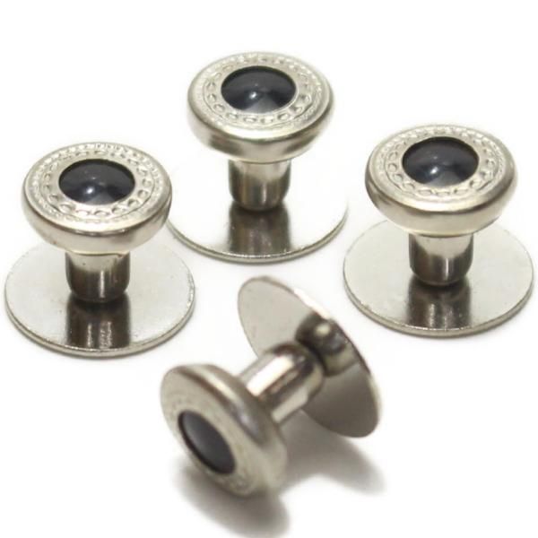 シンプル&ベーシックな固定式で、奥までそのまま挿すだけで留まるようになっているタイプのスタッド/スタッズボタンで4個セットです。カフスボタンやネクタイピンとコーディネートをお楽しみください。