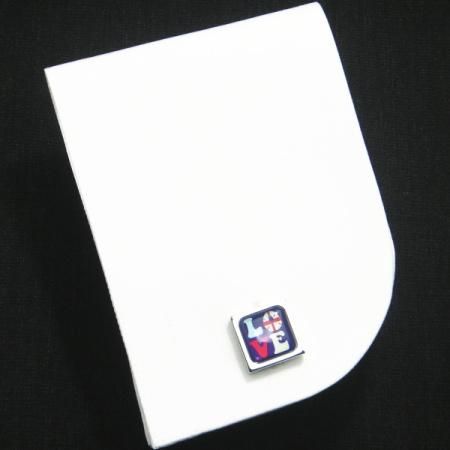 さり気なくOがユニオンジャックで彩られ、ネイビーに映えるカラフルな色遣いが可愛らしい、LOVEモチーフのカフス。