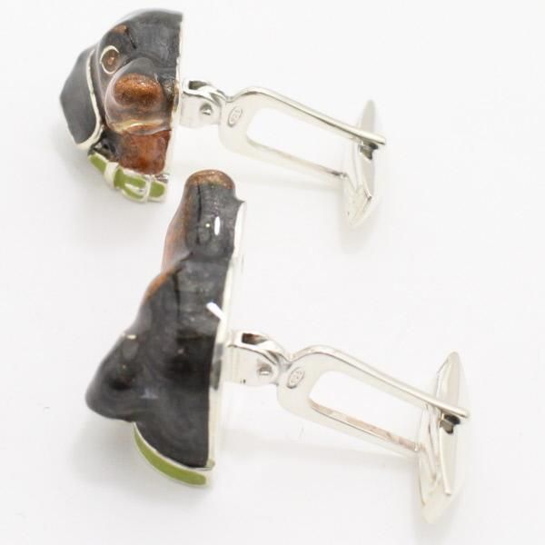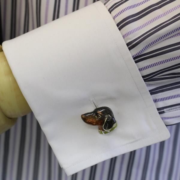 ダックスフントならではの、優しく友好的な表情が美しいカフスです。エナメルはほんのりパールの入った光沢の輝きで上品さを感じます。