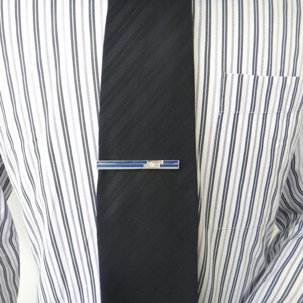 艶やかなシルバーのベースにエナメル、シルバーのキラキラなアクセントの上に大き目で一際輝きの強いクリアストーンが輝く、直線を多用した近代的なデザインがスタイリッシュなタイピン。