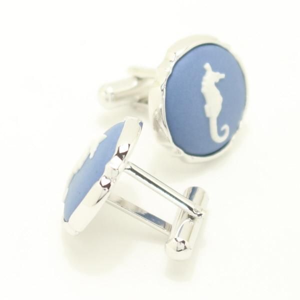 【陶華・TOHCA】シルバー・ラウンド・タツノオトシゴカメオ・ブルー×ホワイトのカフス(カフリンクス/カフスボタン)