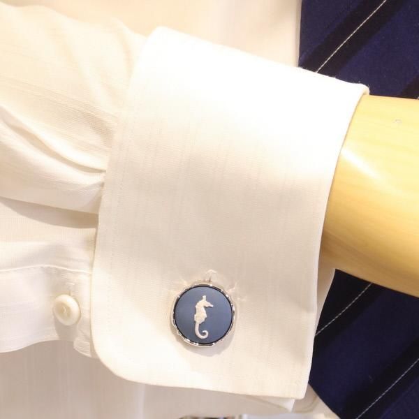 ブルーベースに白いタツノオトシゴが浮き上がるように施された繊細なカメオのカフスです。