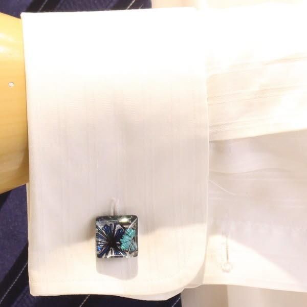 【ThaiVetro】ブルー・フラワーデザンのガラス製カフス(カフスボタン/カフリンクス)