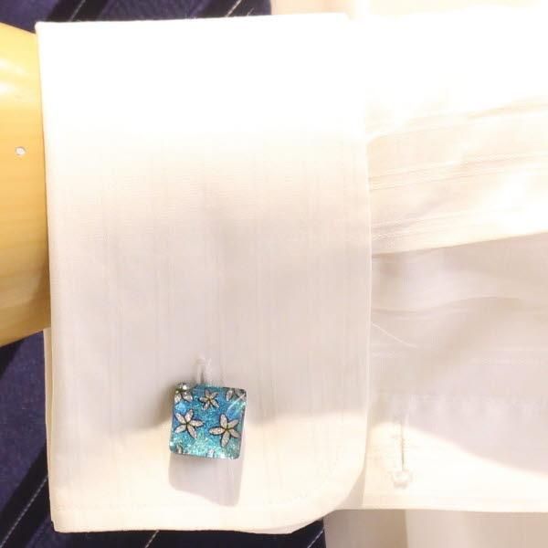 【ThaiVetro】キラキラオーシャンブルー・フラワーのガラス製カフス(カフスボタン/カフリンクス)