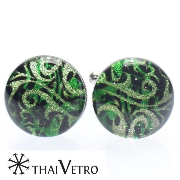 【ThaiVetro】グリーングラデーション・ウェーブデザインのガラス製カフス(カフスボタン/カフリンクス)