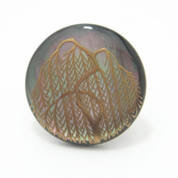 蝶貝とは、真珠を育てる貝の一種で、真珠の様な輝きをします。蝶貝の中でも、色のある黒蝶貝に金粉で柳が描かれています。