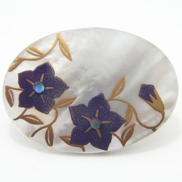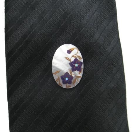 蝶貝とは、真珠を育てる貝の一種で、真珠の様な輝きをします。その蝶貝に、紫の桔梗が見事に調和した、美しいタイタック(ピンブローチ)です。